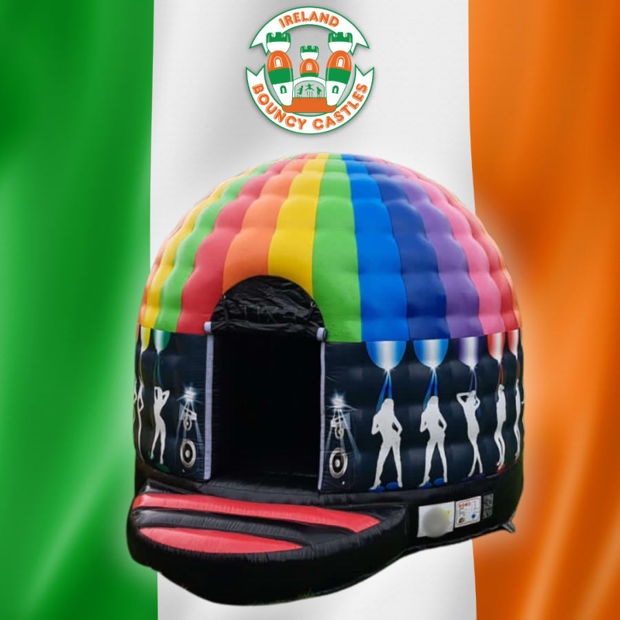 ✅ Size: 12ft (W) x 15ft (D) ✅ Dome-shaped inflatable ✅ Multi-coloured rainbow roof design ✅ Silhouette party artwork on the sides ✅ Optional disco light & Bluetooth speaker inside ✅ Fully enclosed for better sound & lighting ✅ Ideal for kids aged 4–14