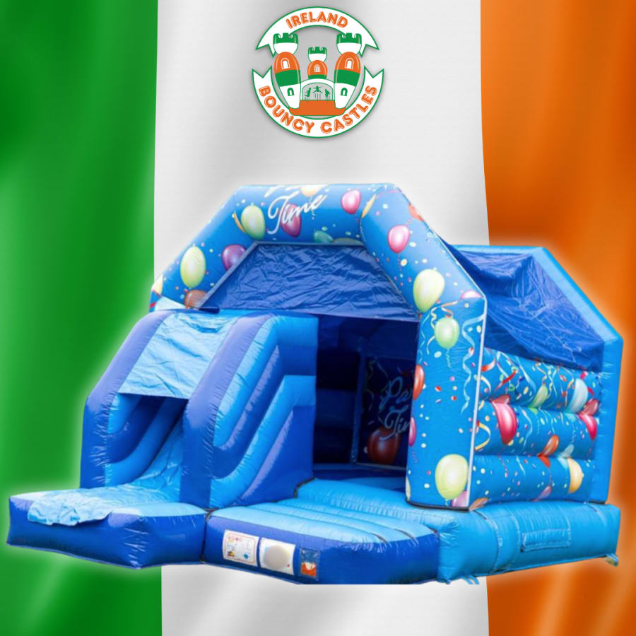 Make your event unforgettable with our Blue Party-Time Front Slide Bouncy Castle! This vibrant inflatable features a bold blue design with colourful balloon and confetti graphics, perfect for birthdays, school fun days, community events, and weekend parties. Kids will love bouncing, playing, and jumping before racing down the exciting front slide over and over again.