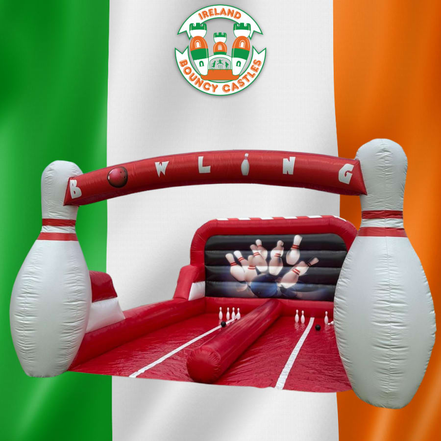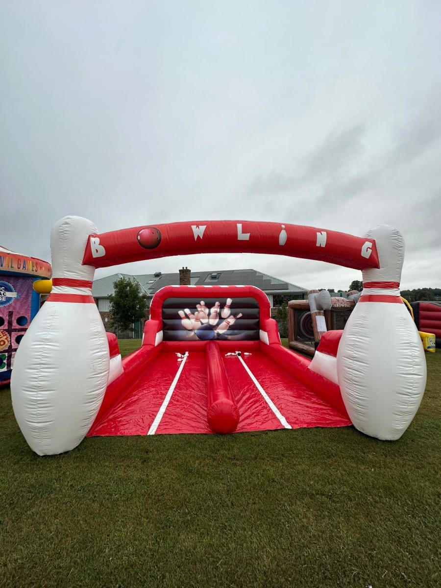 Strike up the fun at your next event with our Carnival Bowling inflatable! Featuring a bold red-and-white lane, giant bowling pins, and a carnival-style archway, this game brings all the excitement of a bowling alley to schools, fairs, fun days, parties, and corporate events. Players roll the ball down the lane to knock over as many pins as possible – it’s simple, addictive, and fun for all ages.